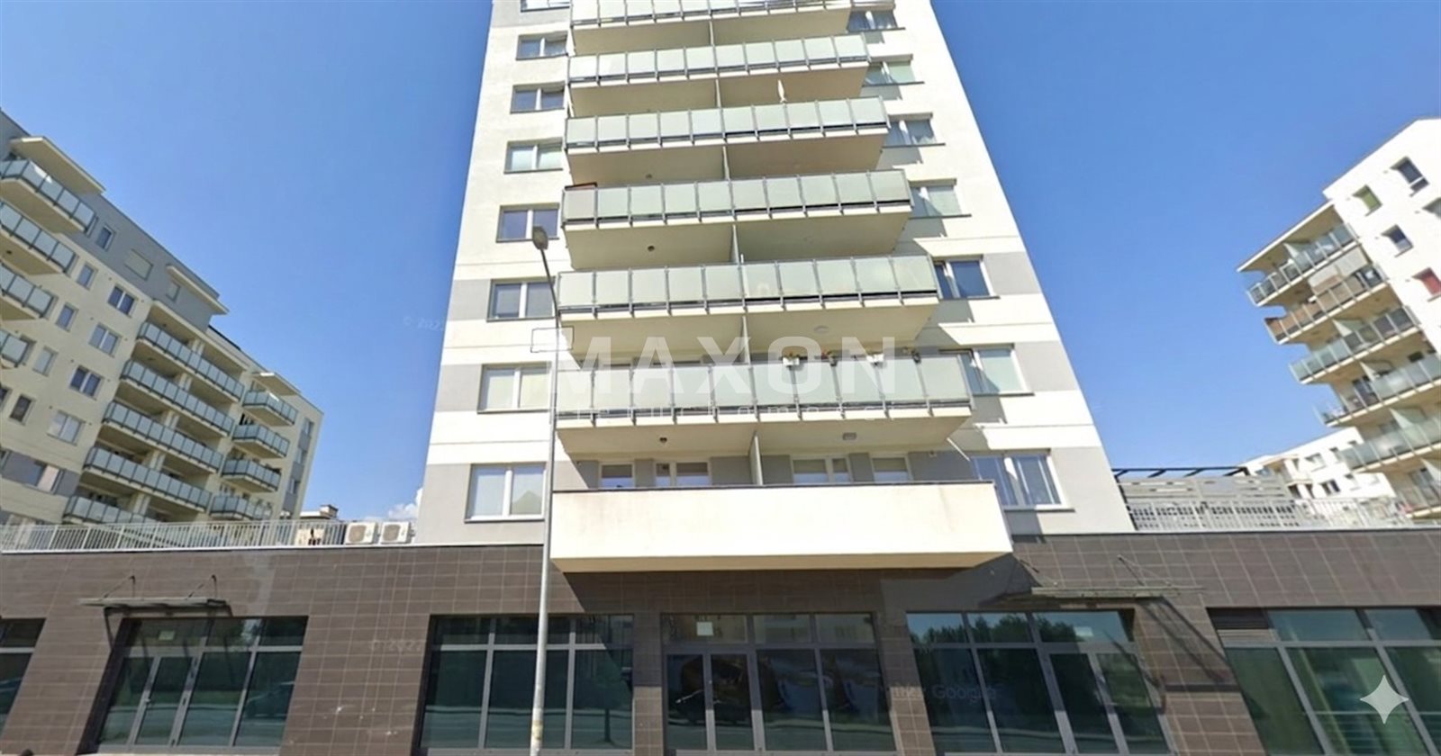 Modern apartment building with commercial units on the first floor.Location