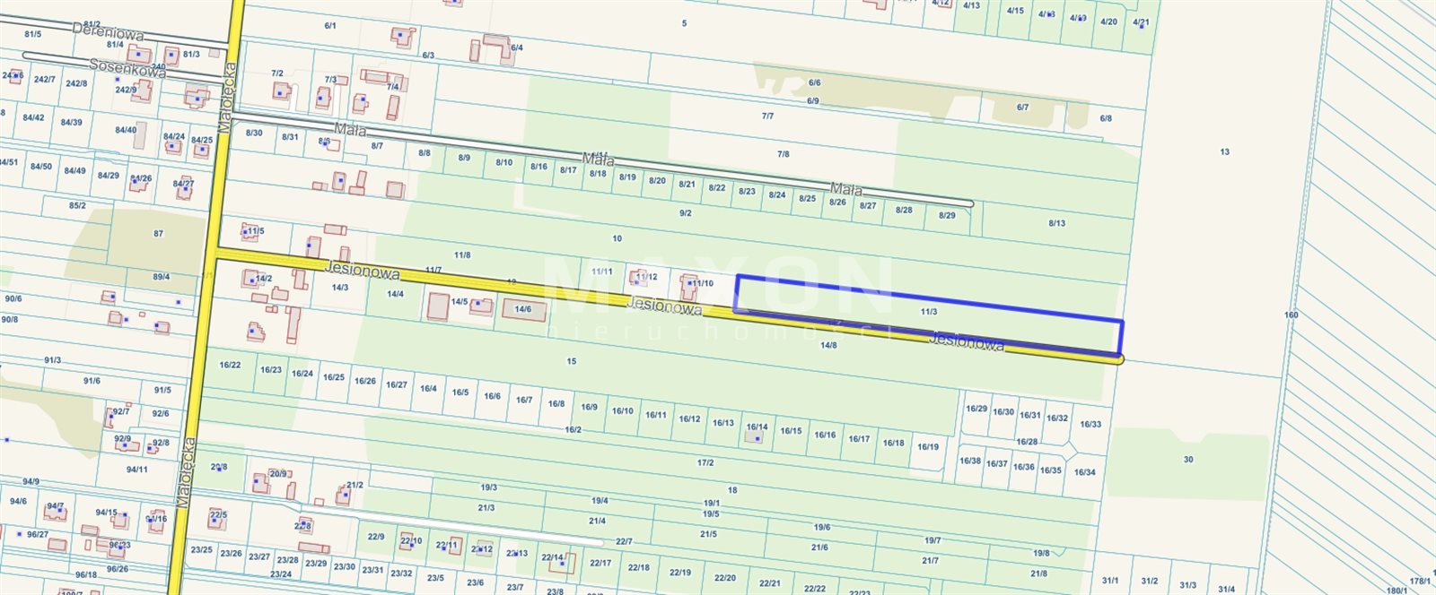 The property is located in a quiet estate near Nieporęt near the Słupecka Forest, near the Royal Canal, at a distance of about 4 km from the border of Warsaw and 20 km - 30-35 minutes from the center of Warsaw. The land is divided into 9 plots with areas ranging from 750 sq.m. to 1,100 sq.m.