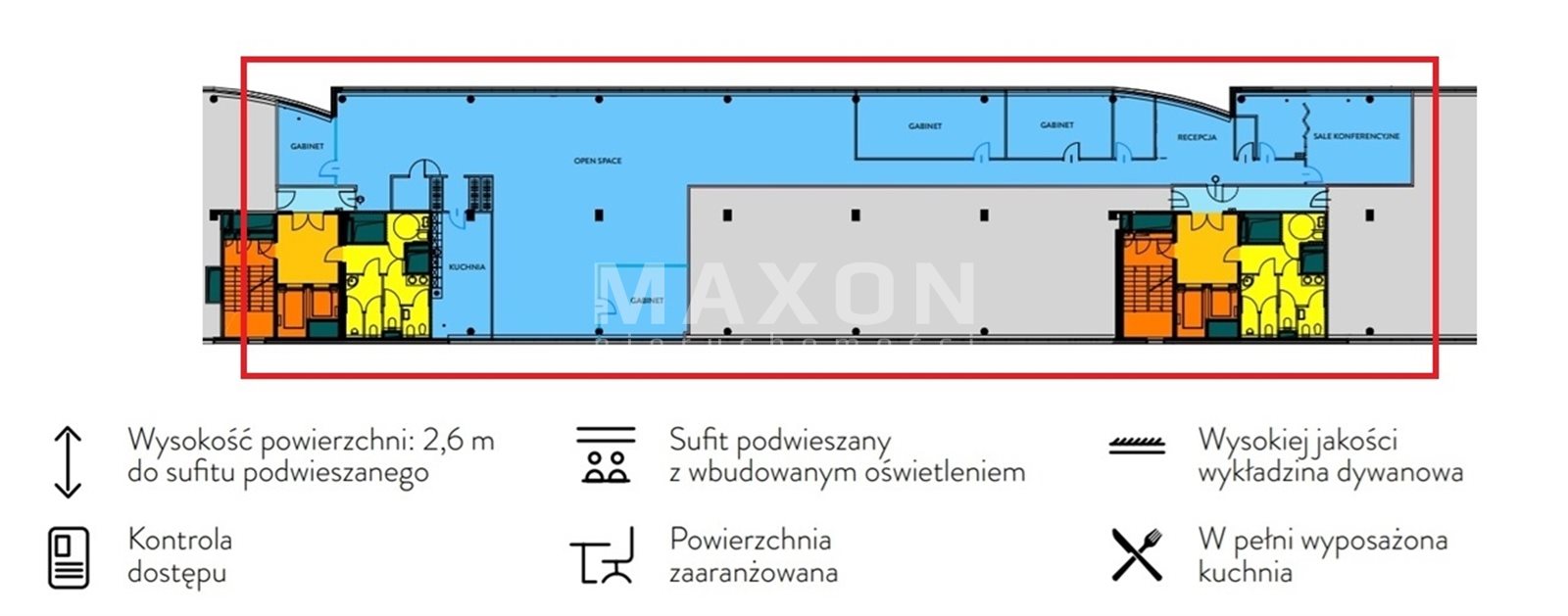Finished office space for rent. The current layout includes: reception area, conference room divided by a movable wall, 4 offices (2 with glass walls), open space, fully equipped kitchen, server room.