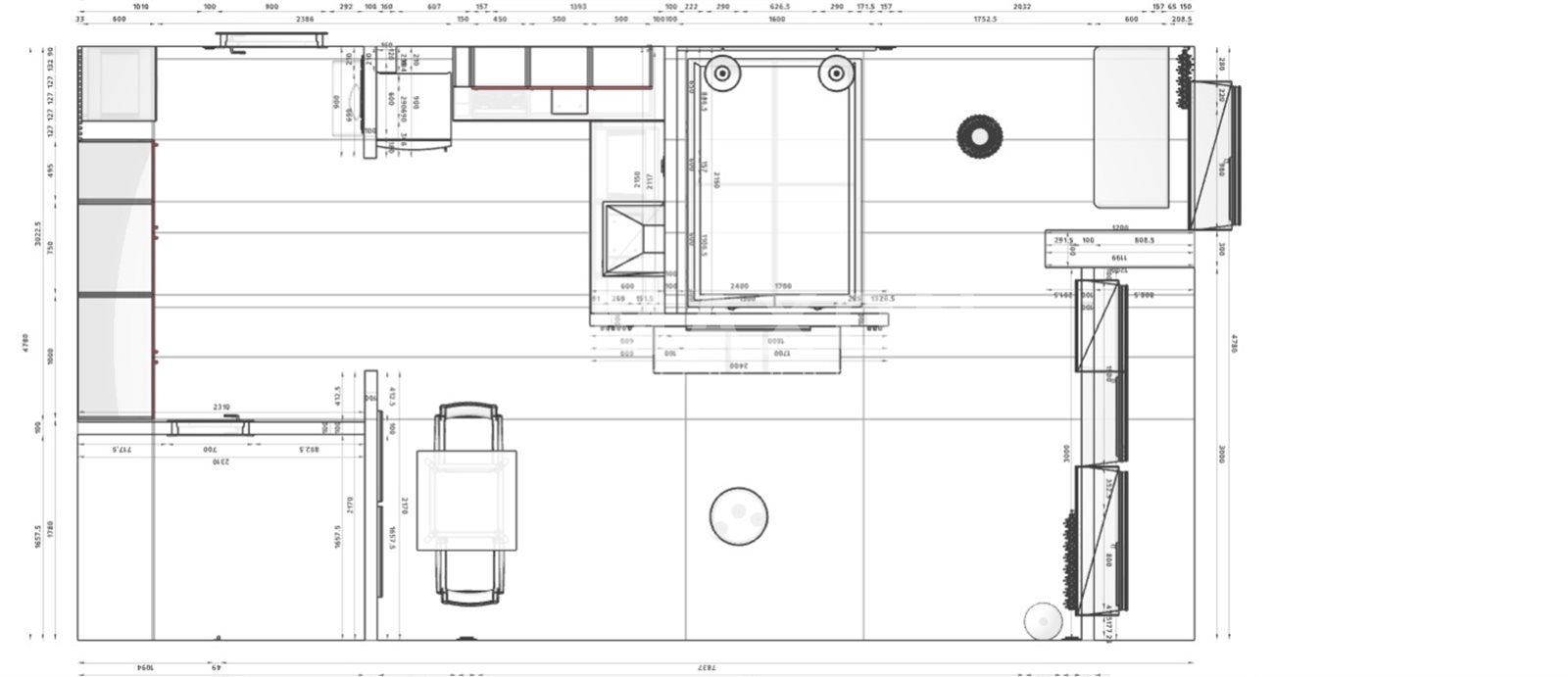 - The living room features a sofa, a table with chairs, a chest of drawers, and a TV cabinet