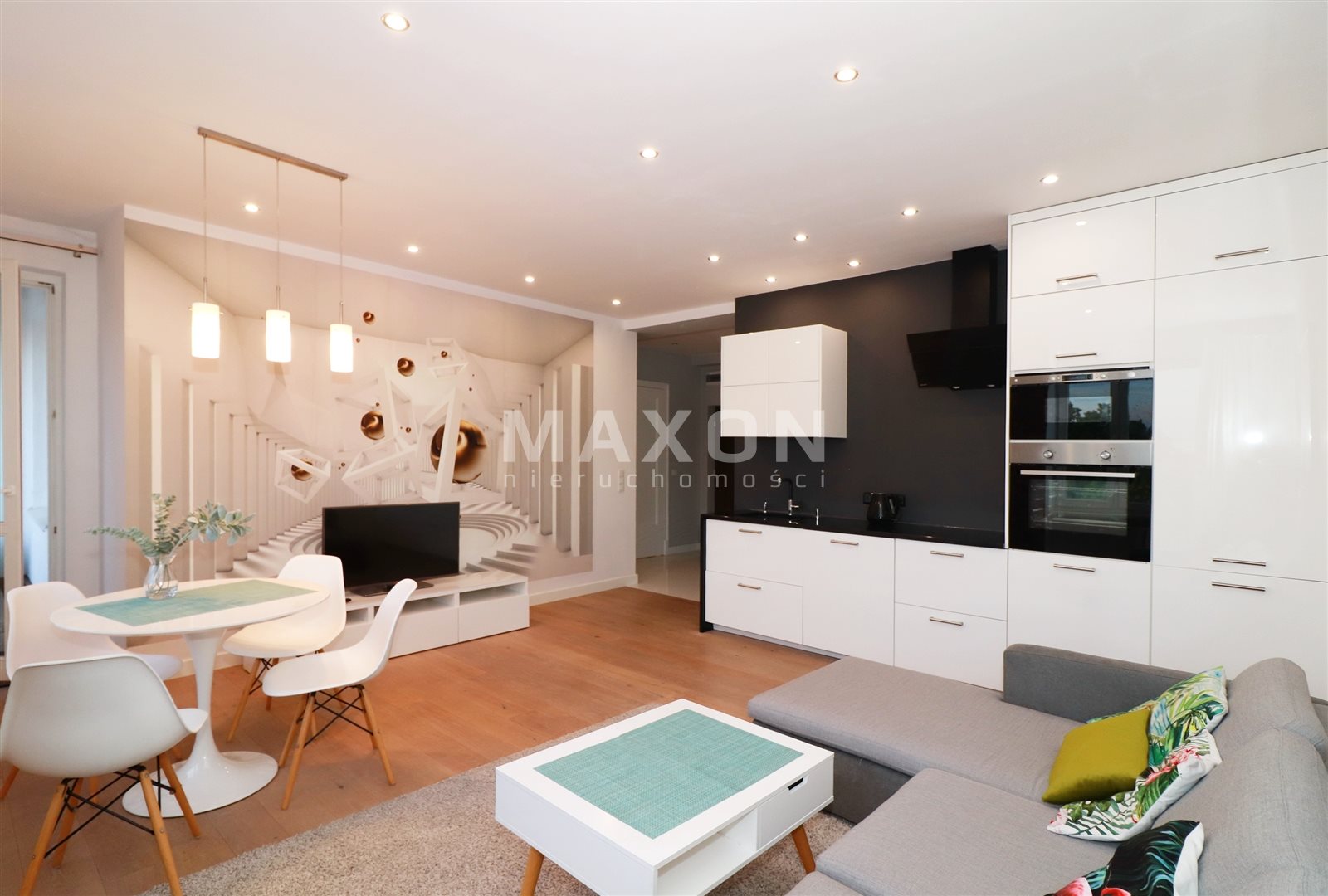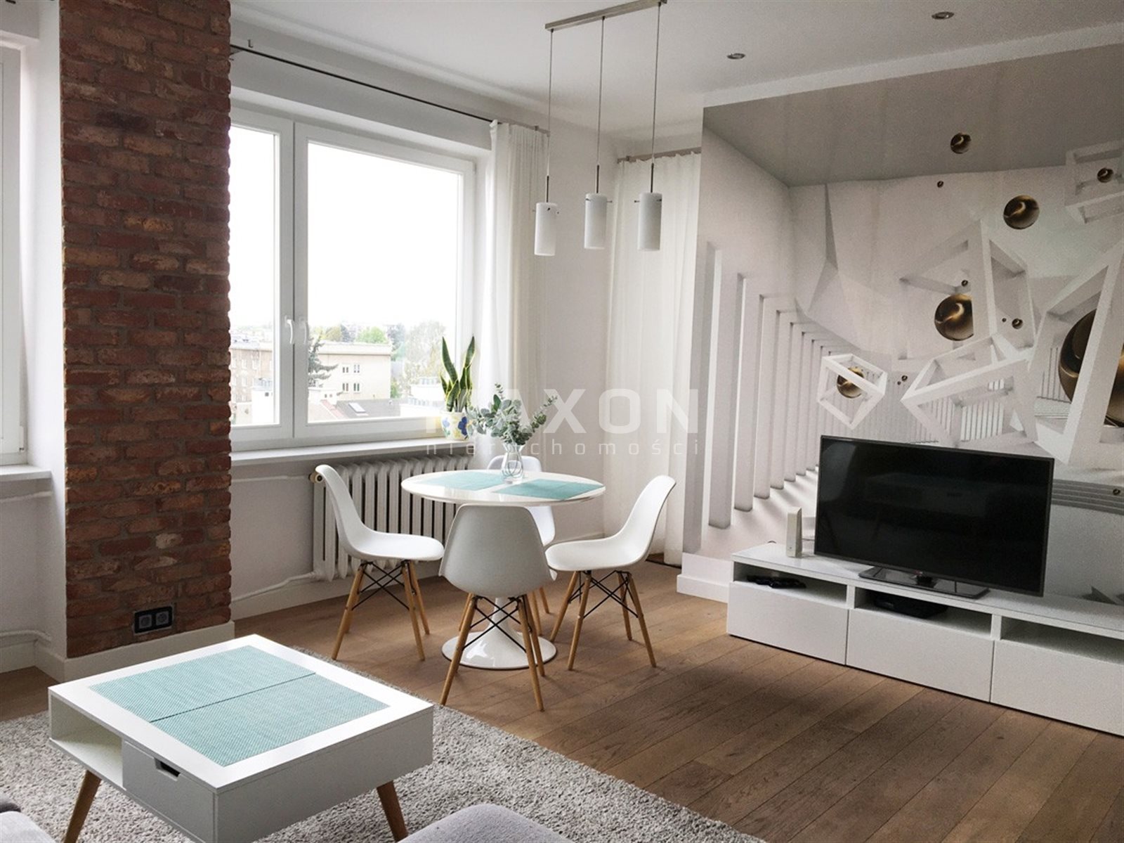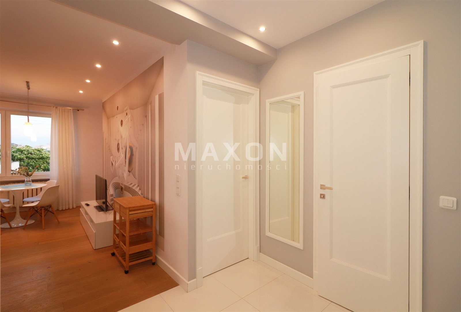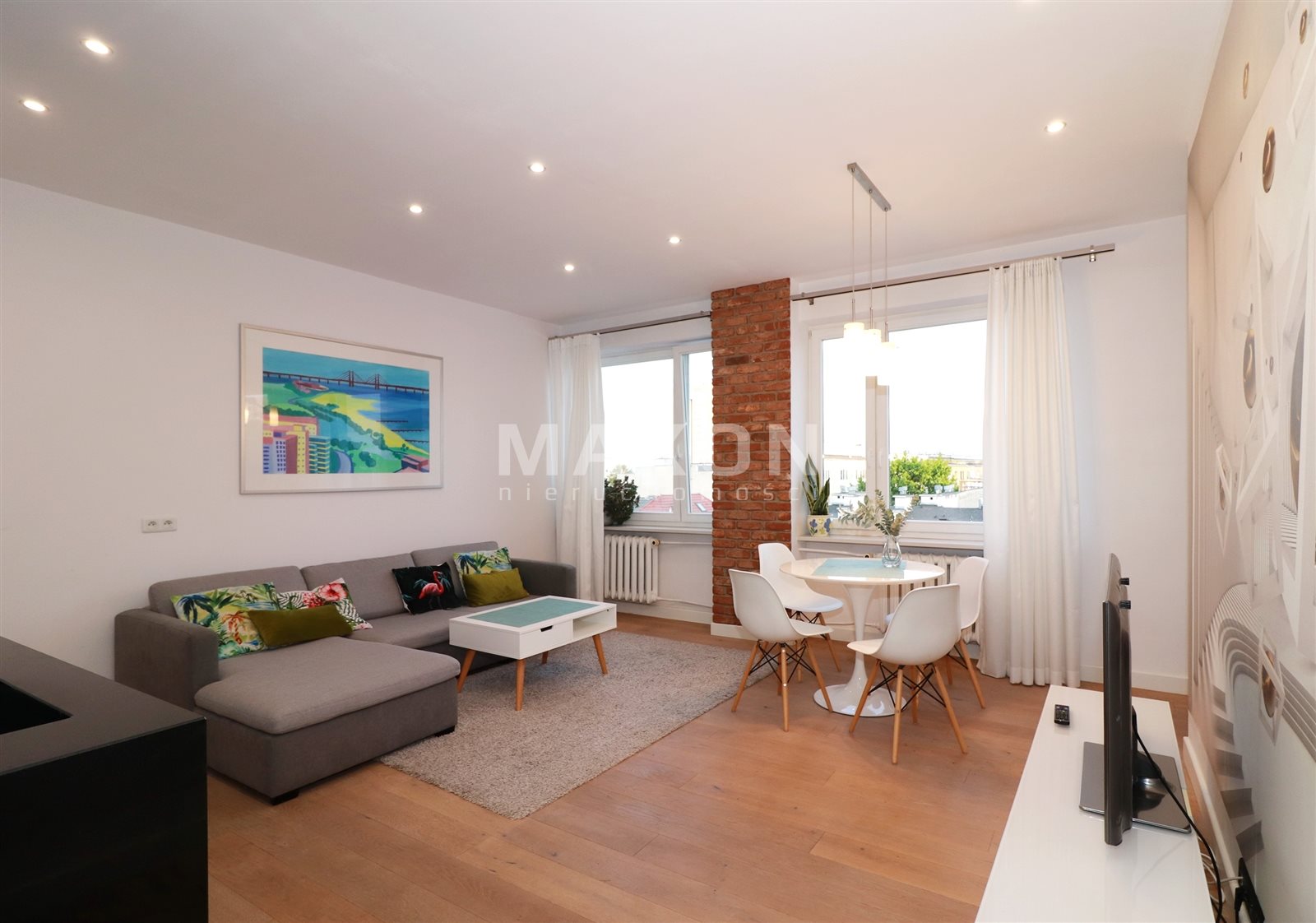 The apartment is decorated modern with artistic elements. Everything finished to a high standard. Plenty of space to store things. In the hallway closets, dresser and mirror. In the bedroom double bed, closet, bedside tables and bookcase. In the living room with large windows a sofa bed, cabinet and TV, coffee table, table with chairs.