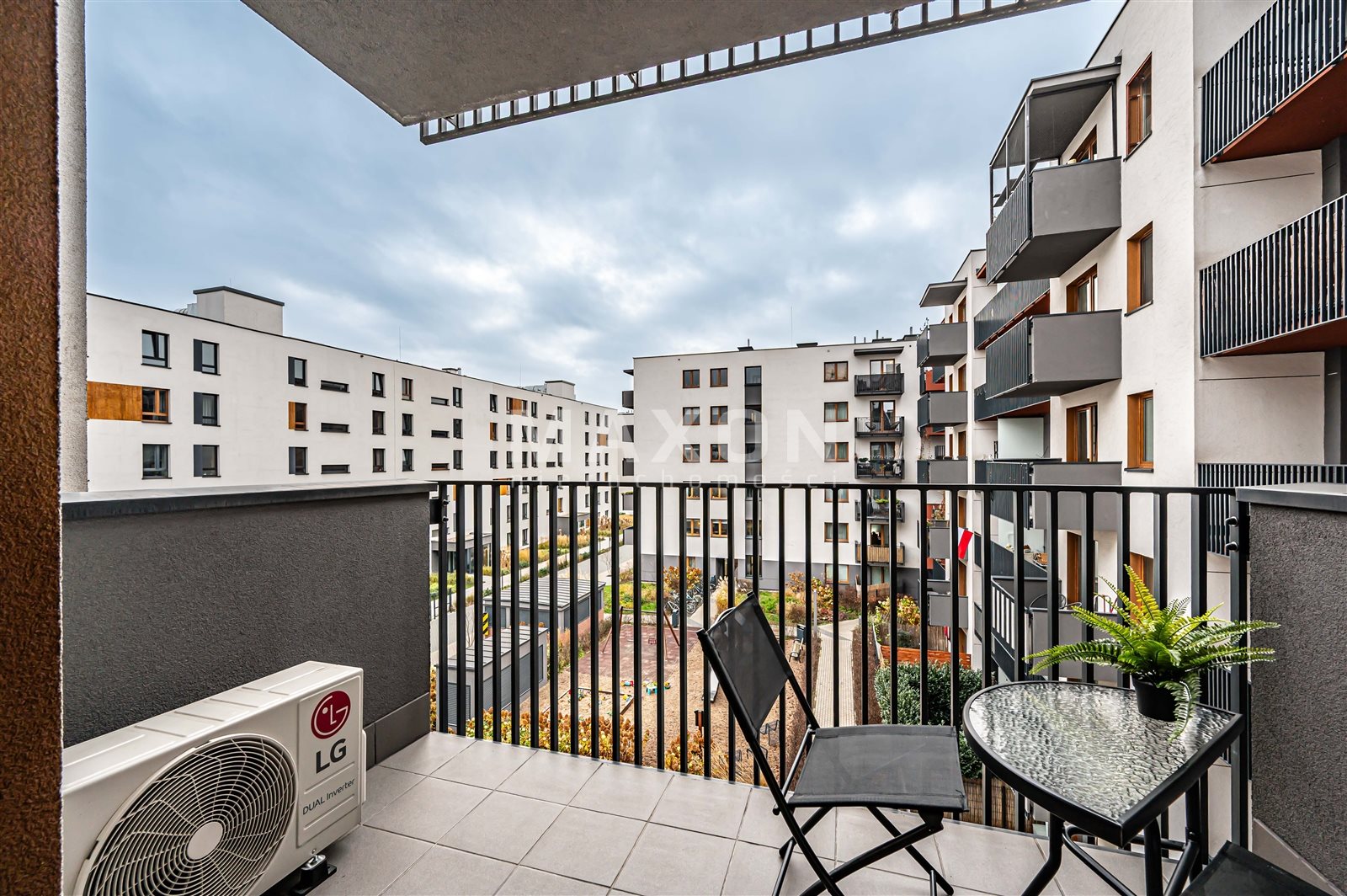 Modern building from 2022, with representative staircases and a well-kept patio with benches.