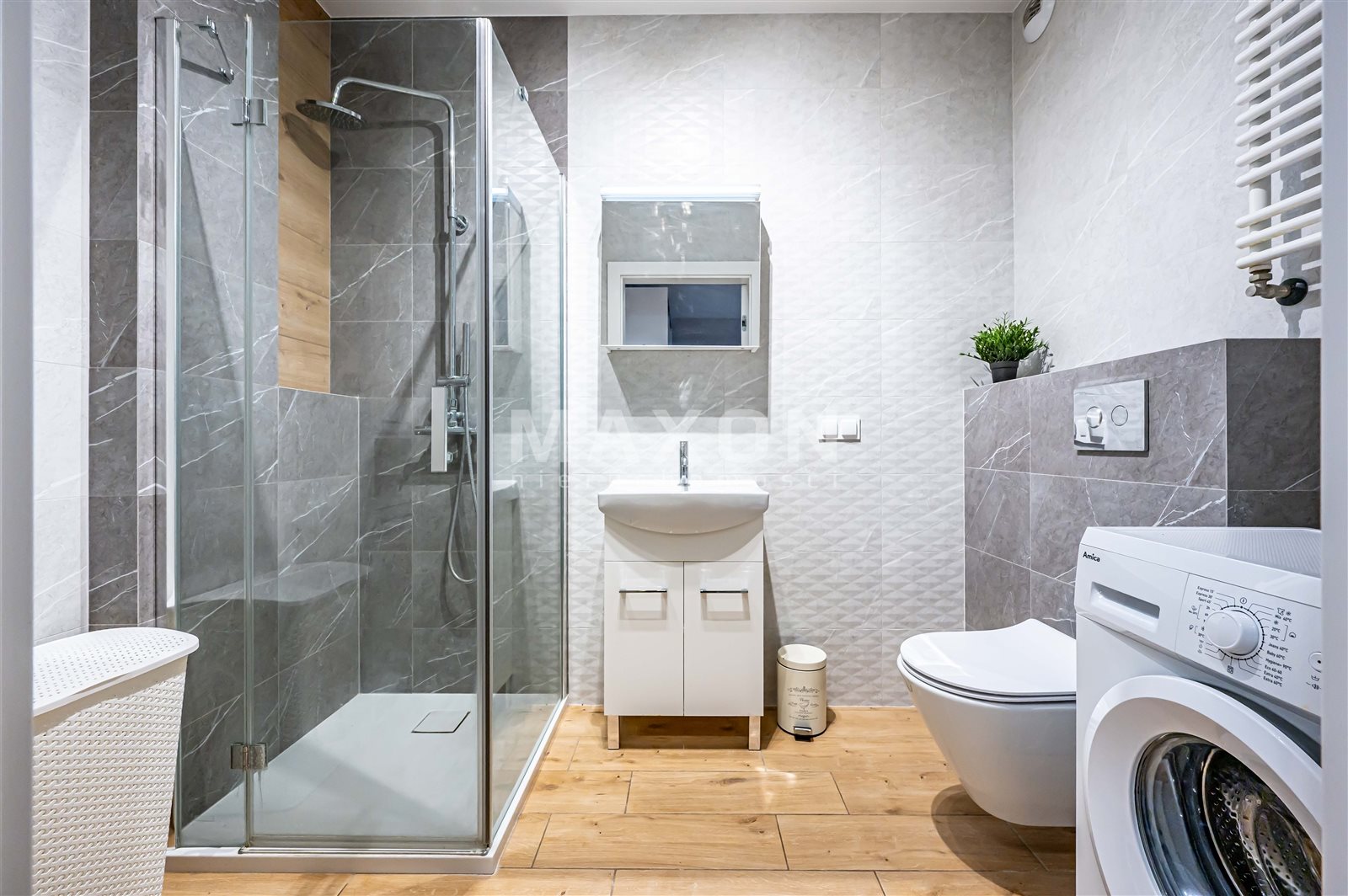 Bathroom with shower, sink, washing machine, toilet bowl and cabinets.