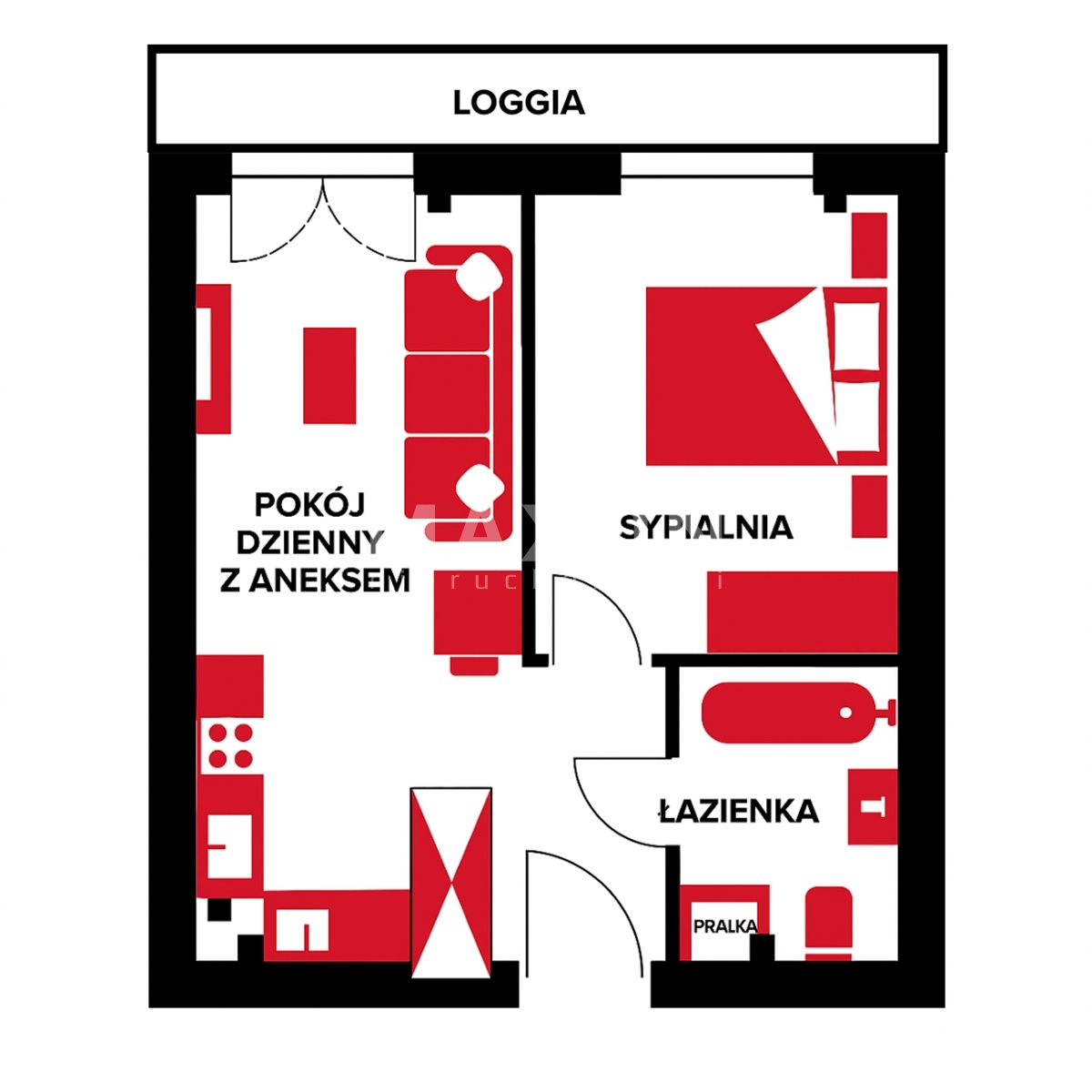 Living room with kitchenette - bright living area with TV, sofa with sleeping function and exit to the loggia.