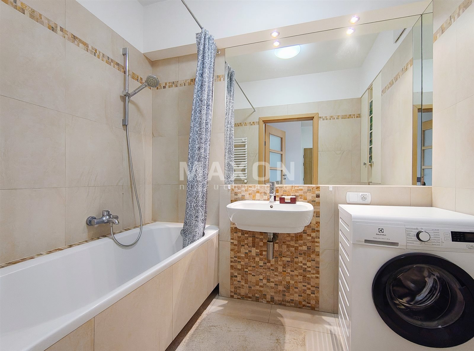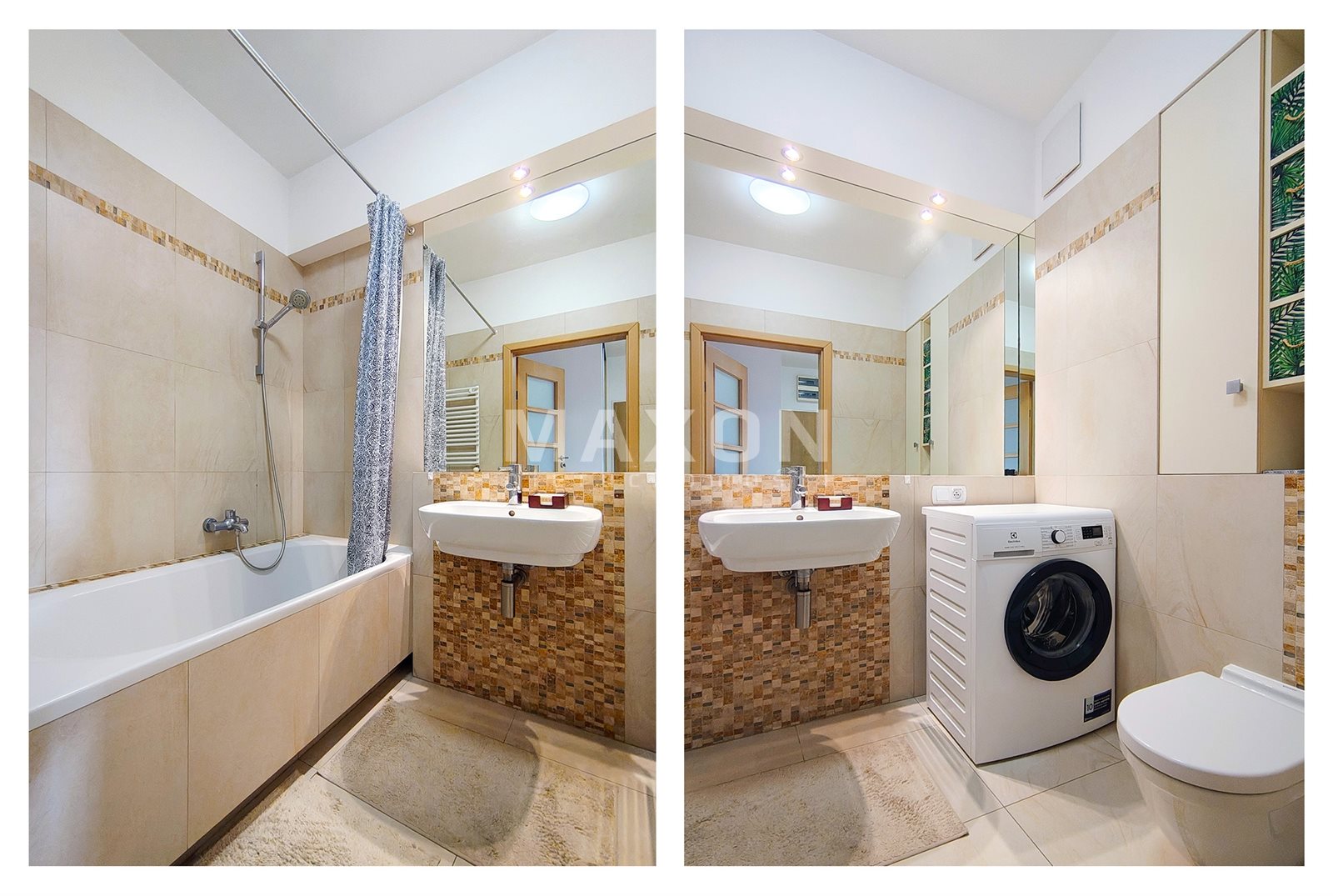 - Bathroom with a bathtub, equipped with a washing machine,