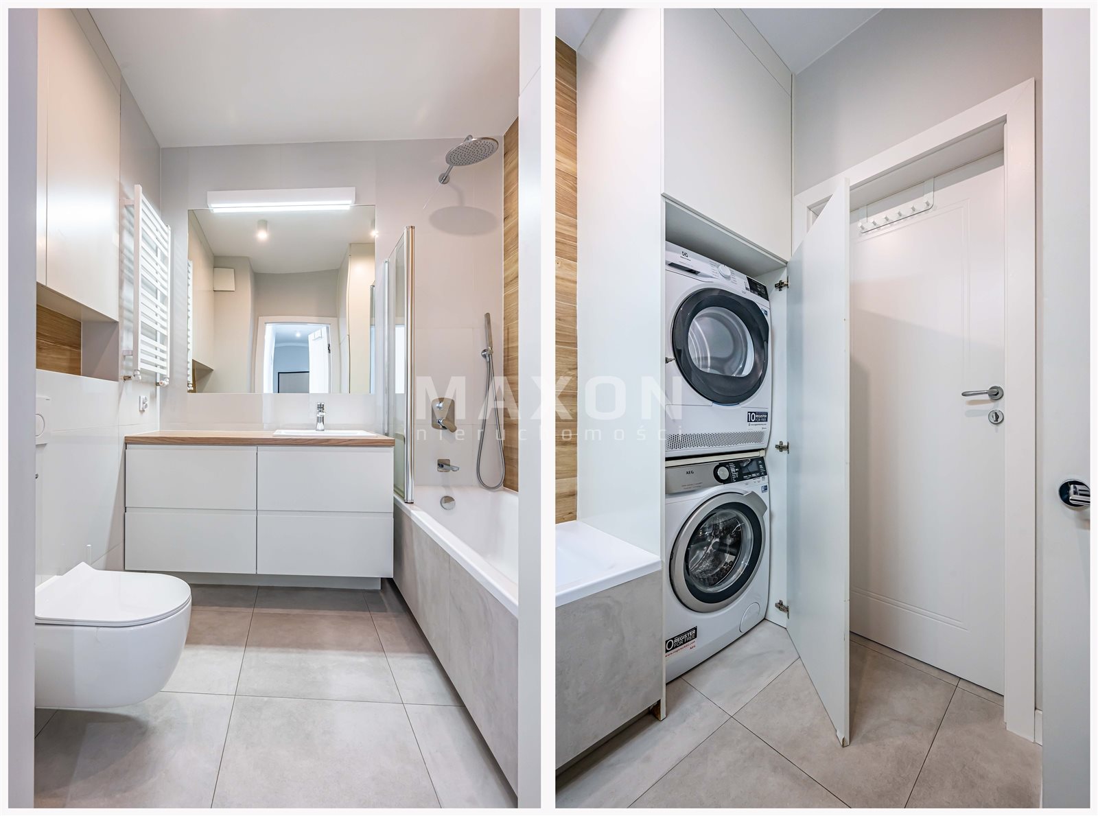 The bathroom features both a washing machine and a dryer, ensuring complete convenience.