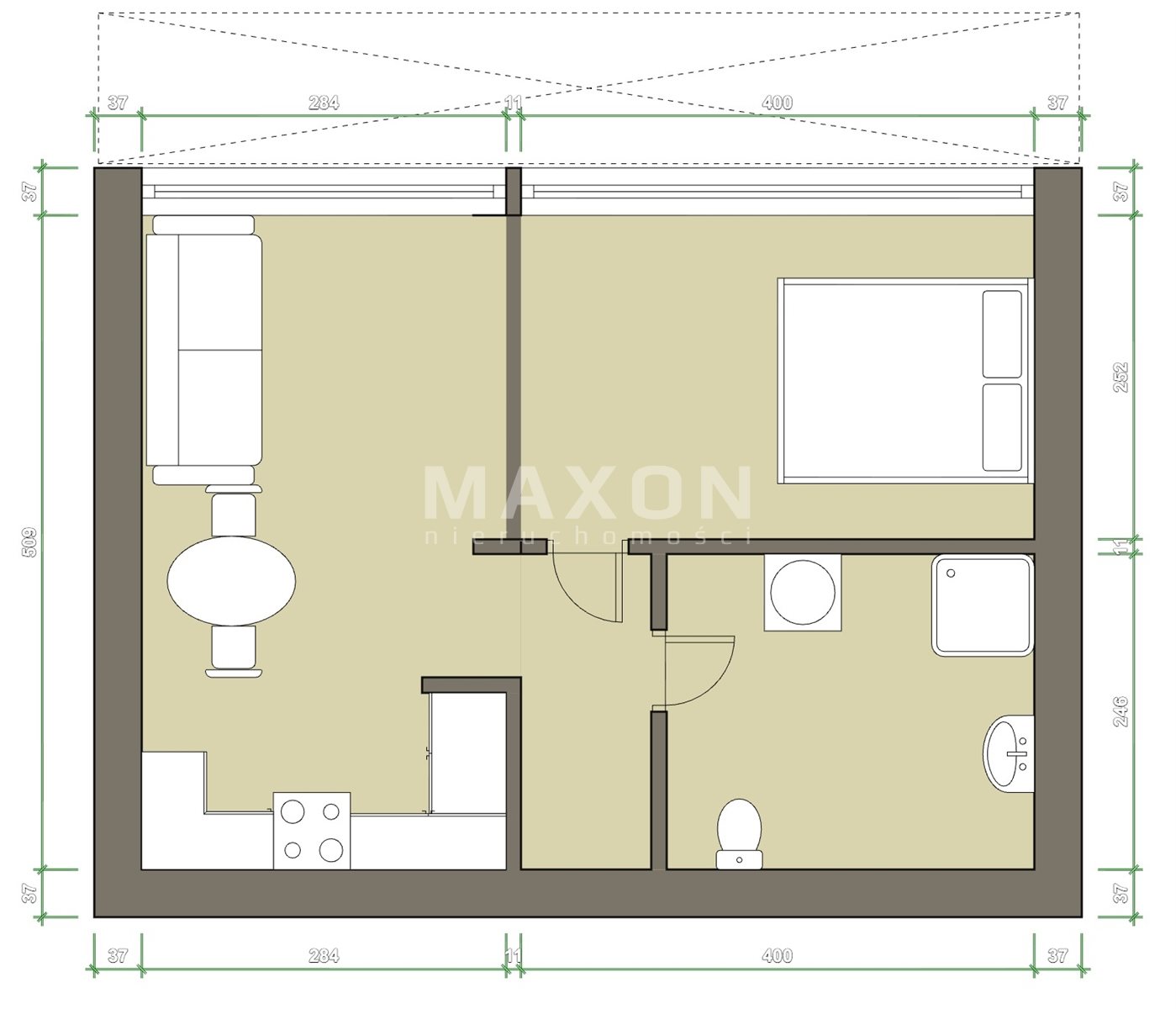 Pokój z kuchnią 34 m2 balkon, garaż