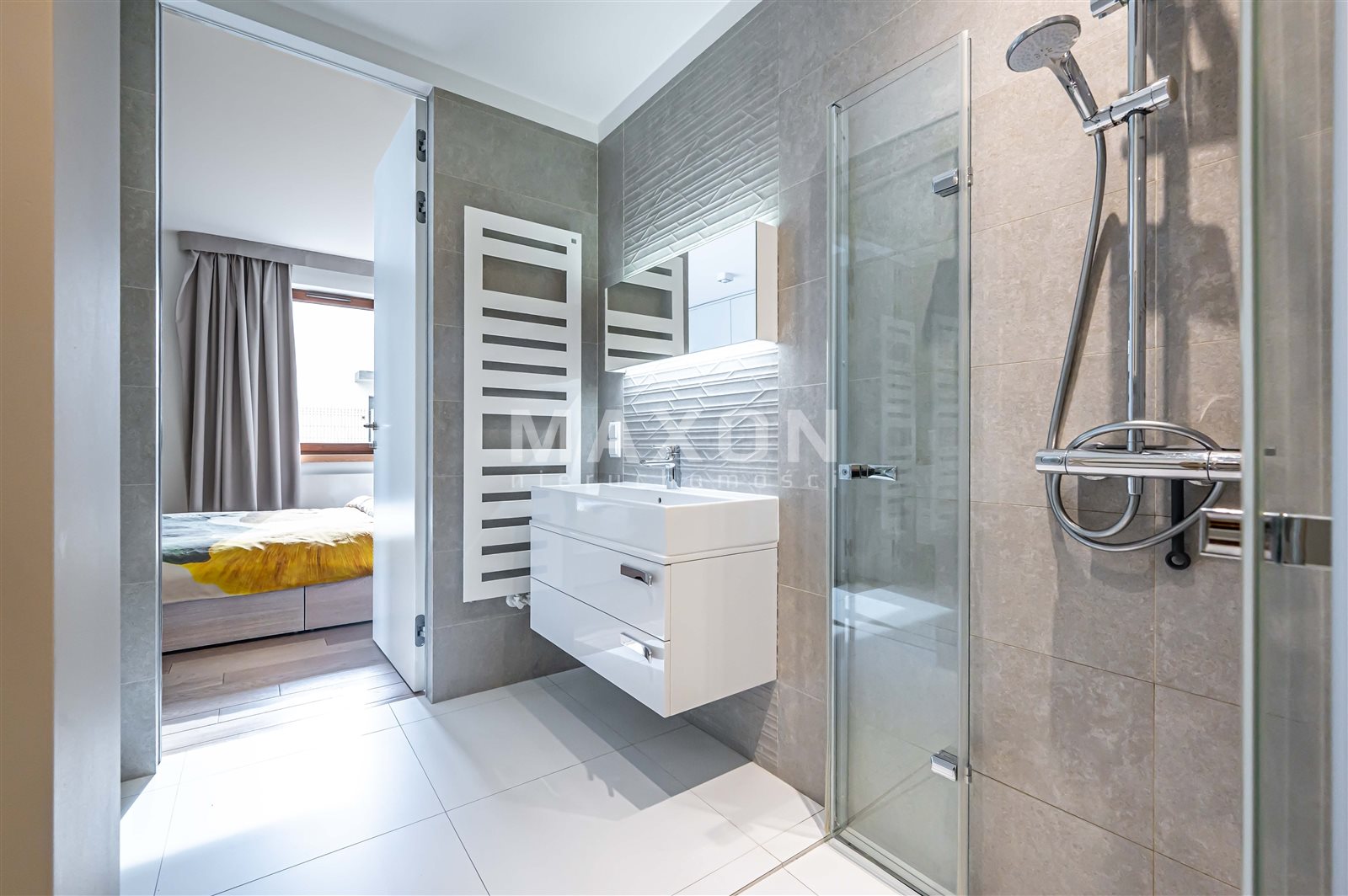 There is also a comfortable bedroom with direct access to the bathroom, which can also be accessed from the hallway—a convenient and functional solution. The apartment features spacious built-in closets in both the hallway and the bedroom.