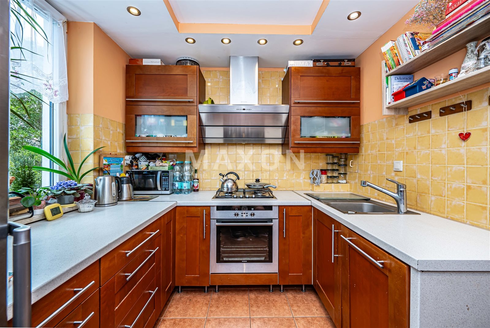 A separate kitchen with a window - very bright, with full-size built-ins and space for cooking,
