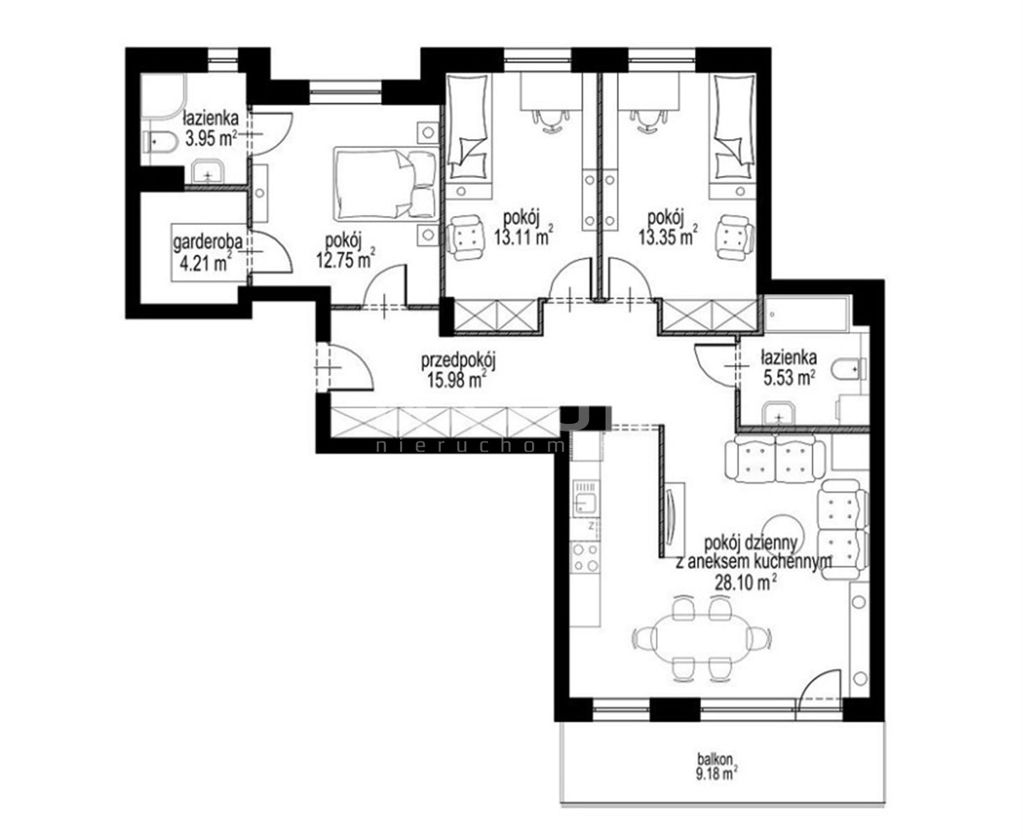 • 3 bedrooms: 13.35 m² | 13.11 m² | 12.75 m²