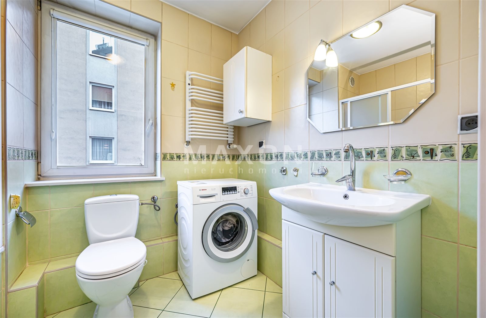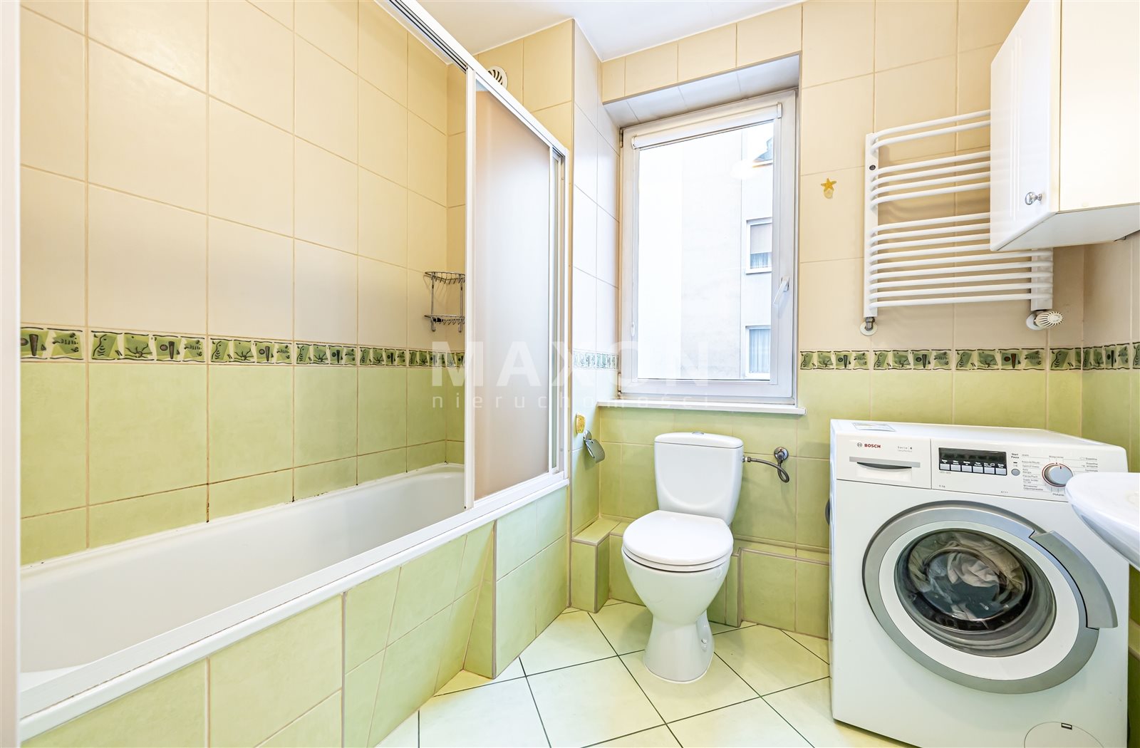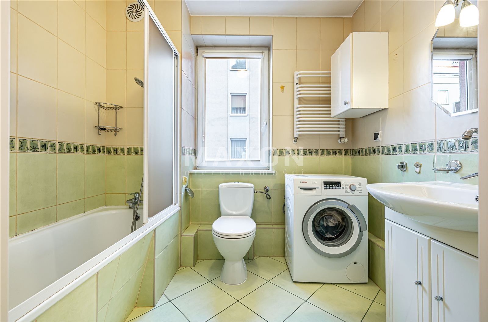- a large bathroom with a window, a bathtub with a shower function, a washing machine, and a toilet.