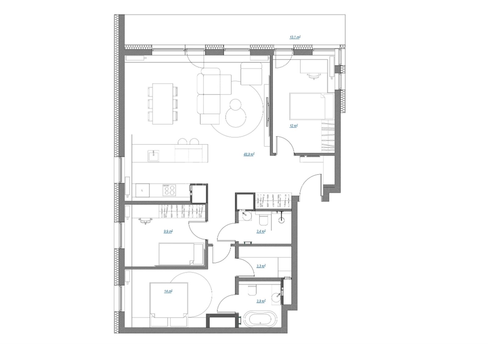 -two rooms (bedrooms, children's rooms, study) – 10m2 and 12m2