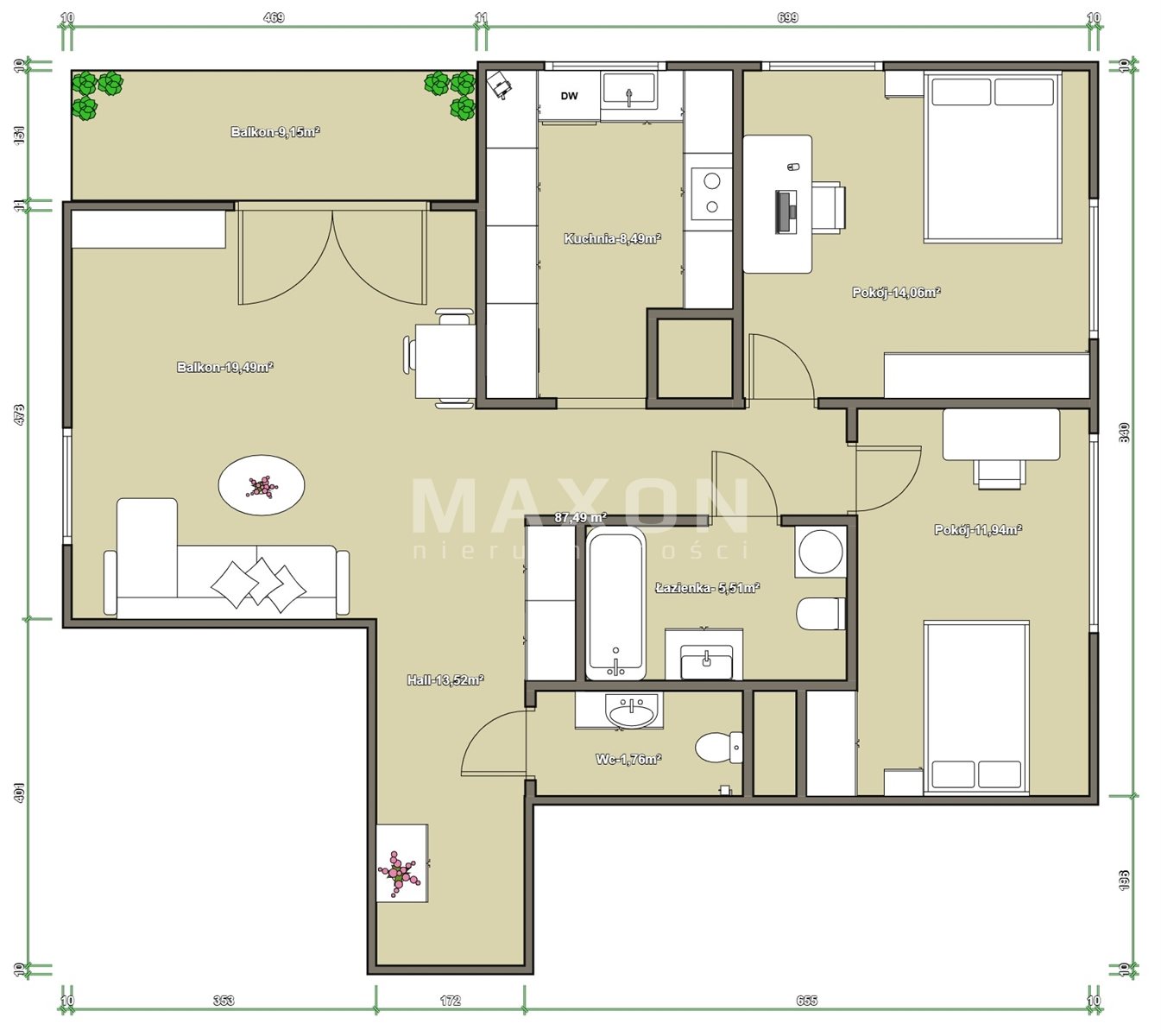 - a spacious living room—19.49 sq. m—with access to a 9.15 sq. m balcony