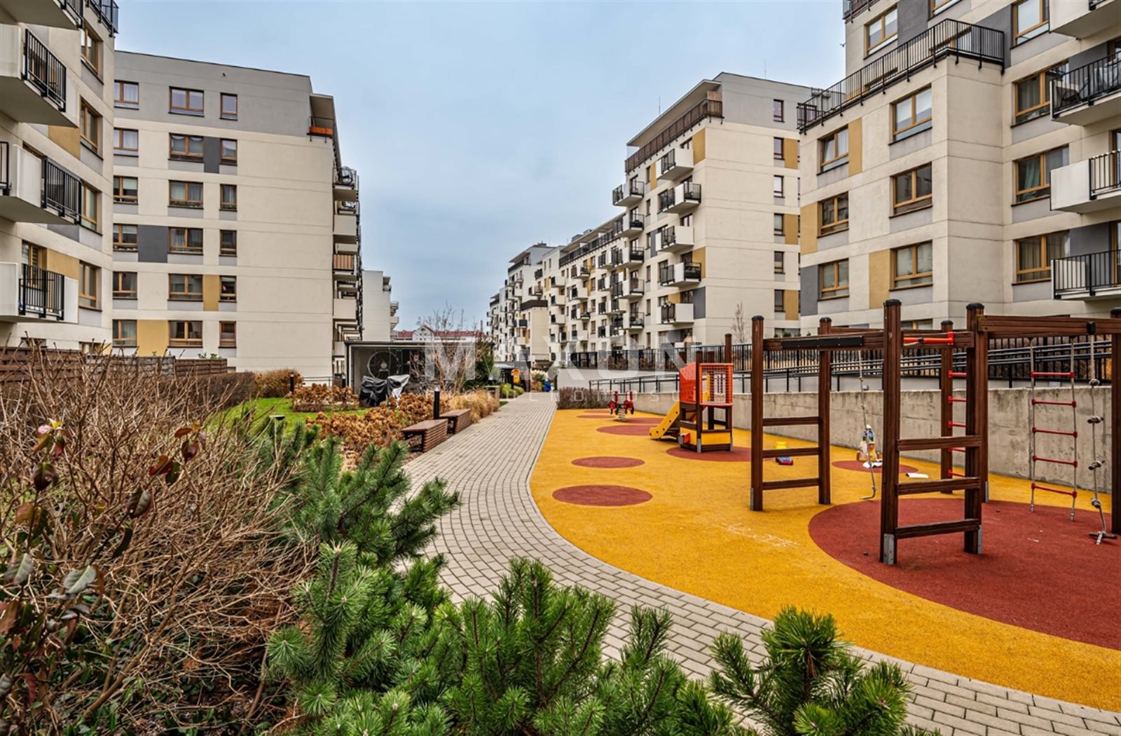 Well-designed space around the buildings, green relaxation areas with sun loungers and benches, a mini basketball court, an outdoor gym, ping-pong table, children's playground, chess tables, and facilities for people with disabilities make this place modern and responsive to the needs of its residents.