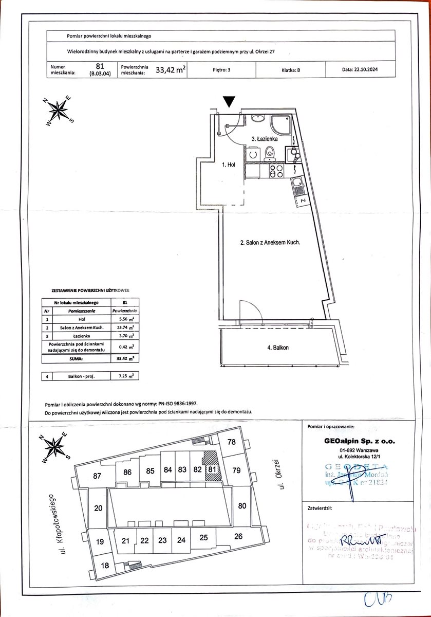 For sale: a studio apartment with an area of 33.42 sq. m., featuring a balcony (7.25 sq. m.), located on the 3rd floor of a modern building in the “Na Okrzei” development, built by Matexi Polska. The apartment has been inspected and approved and is currently in a developer’s finish—ready for your own interior design.