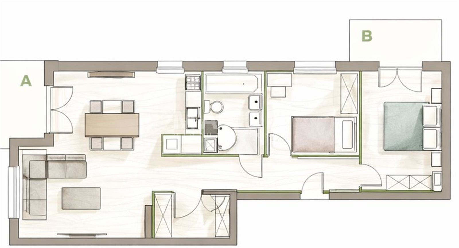 The layout of the apartment is extremely practical, and the separation of the living area from the private area ensures the comfort of everyday life.