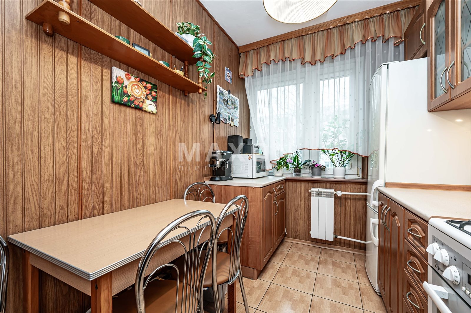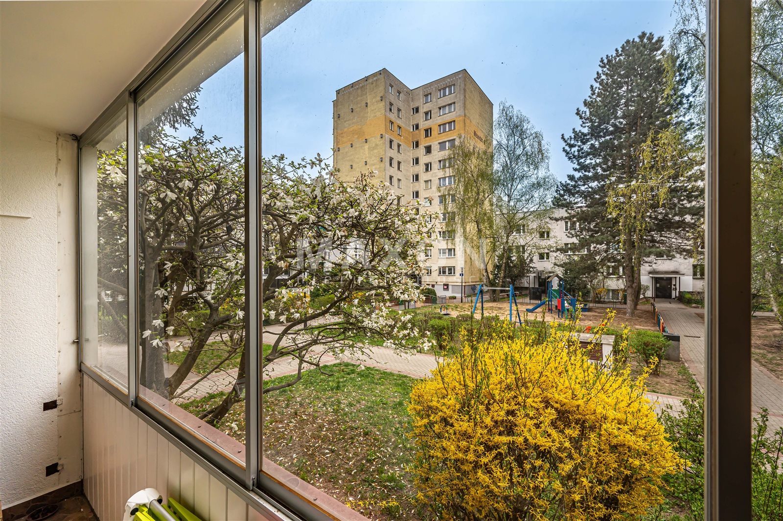 The apartment is 52.90 sq. m., with 3 rooms, a loggia, and a basement. It is located on the high ground floor, overlooking a large green space in the middle of a nicely landscaped neighborhood.