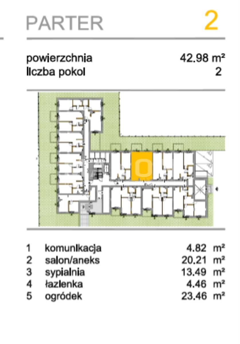 2-bedroom apartment with an area of 42.98 sq m and a garden with an area of 23.46 sq m (ground floor)