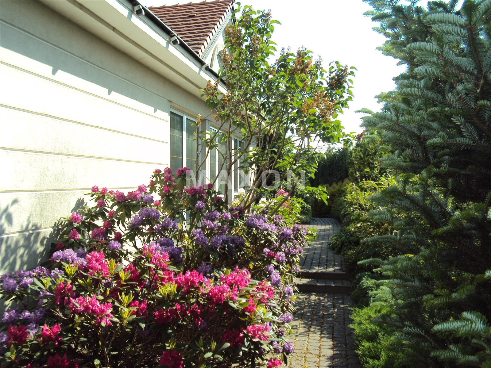 The house is surrounded by a well-maintained garden featuring meticulously selected plant species. The garden is beautiful and colorful.
