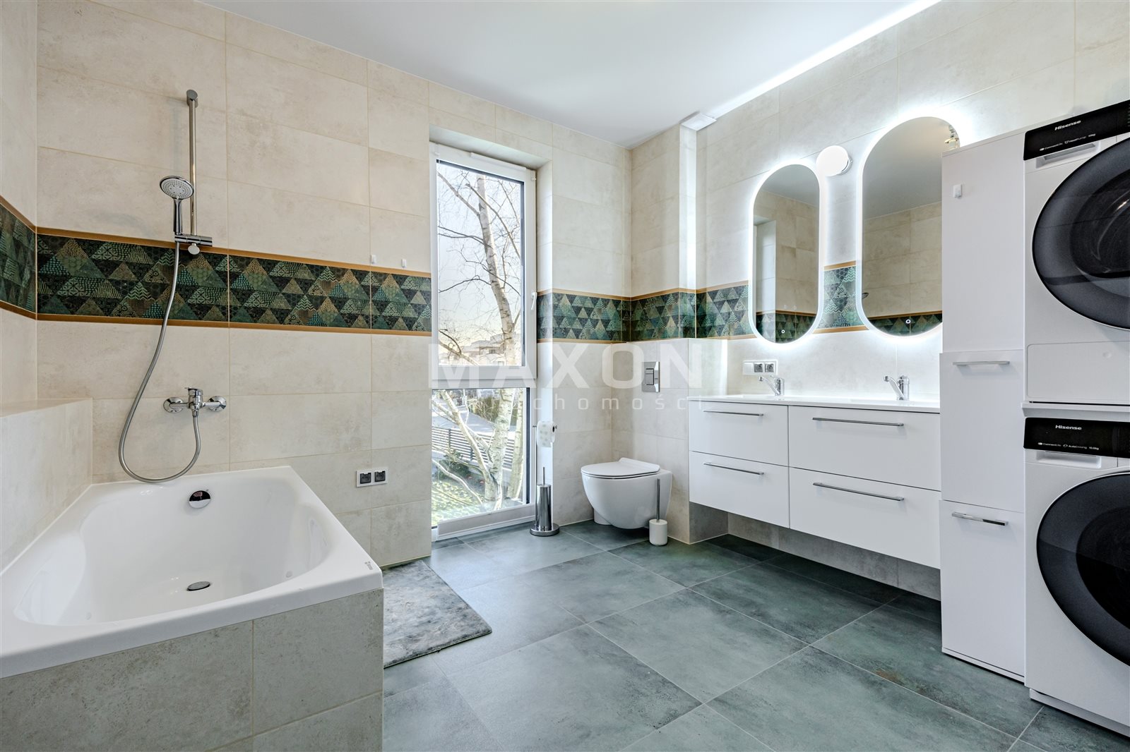 - bathroom with shower, bathtub, 2 sinks, and washing machine