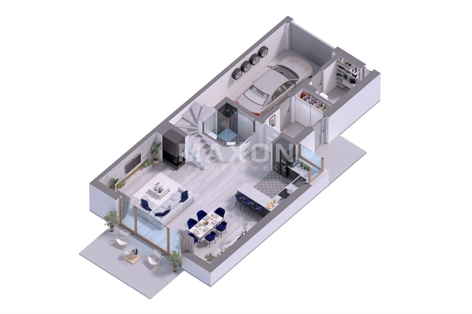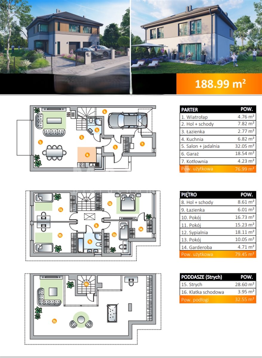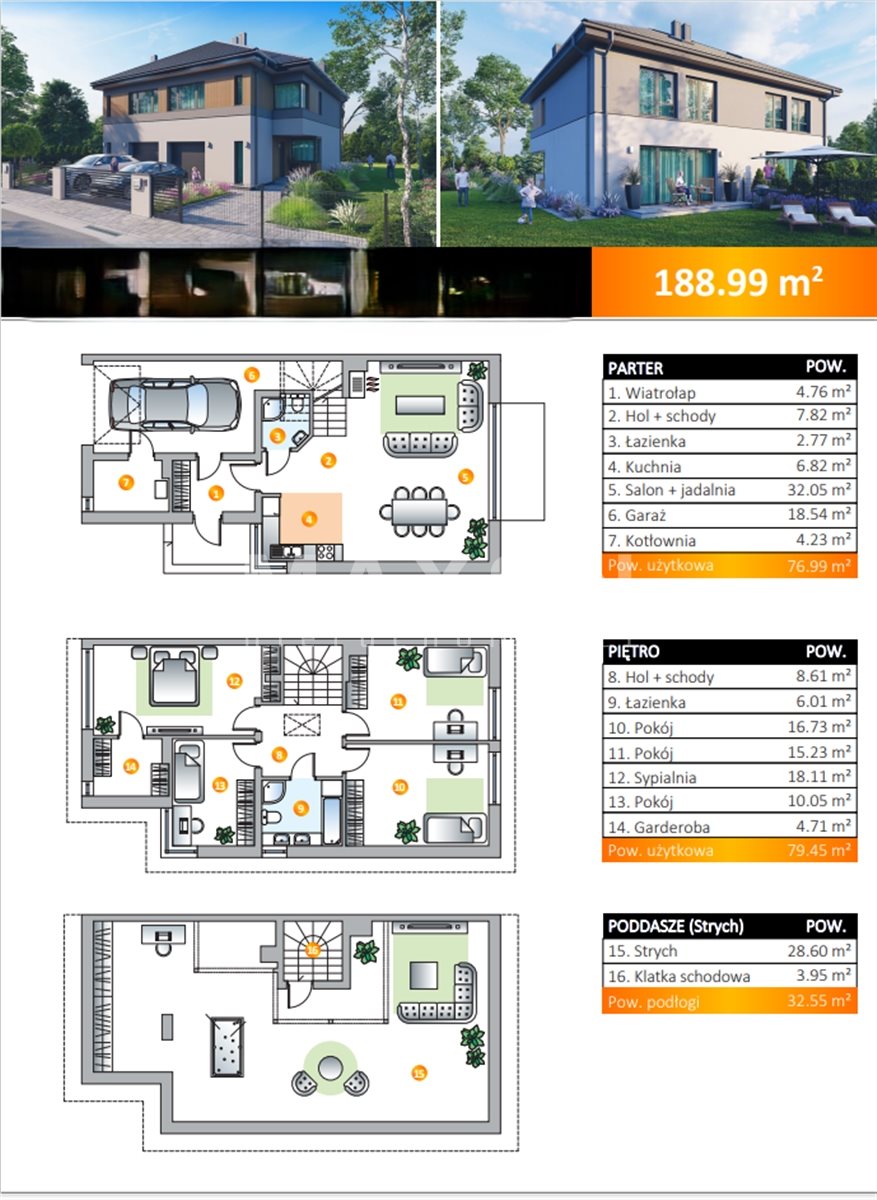 The semi-detached house with a garage in the body of the building of the area. 188,99sqm, has 6 rooms, is located on a plot of 445sqm. It consists of 3 floors.