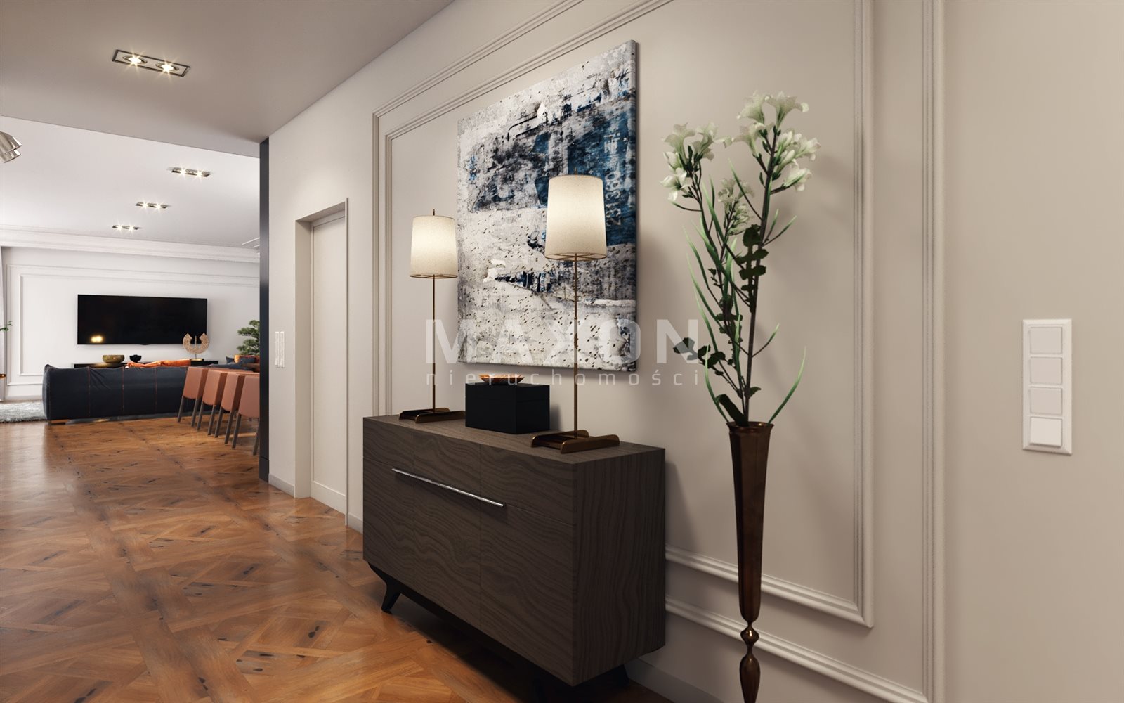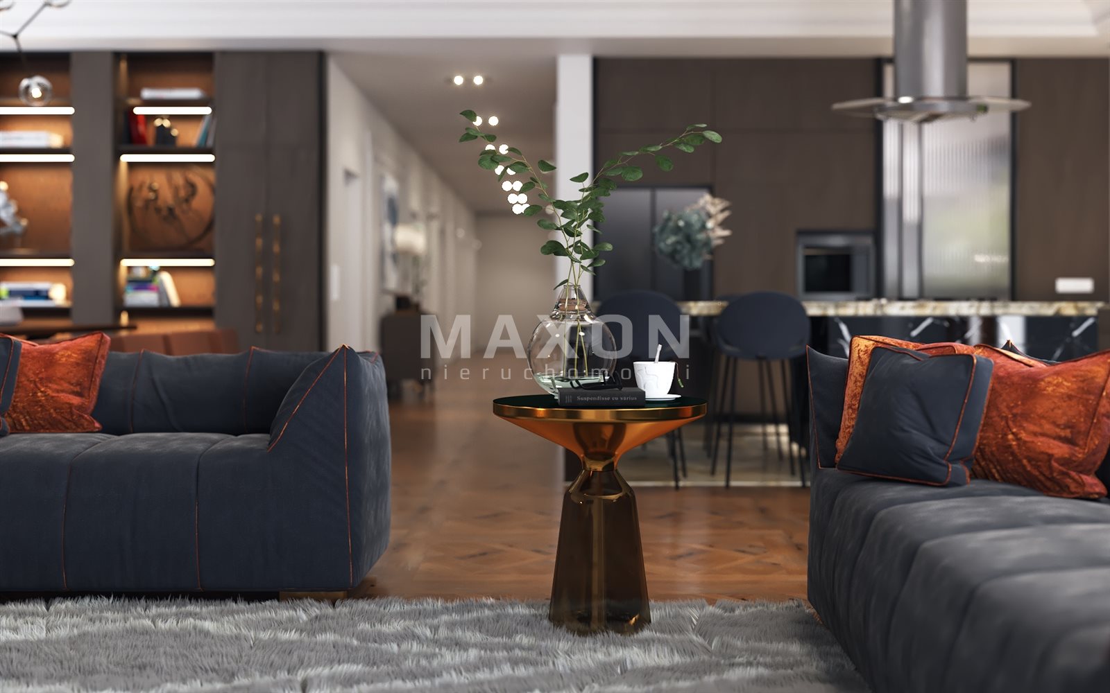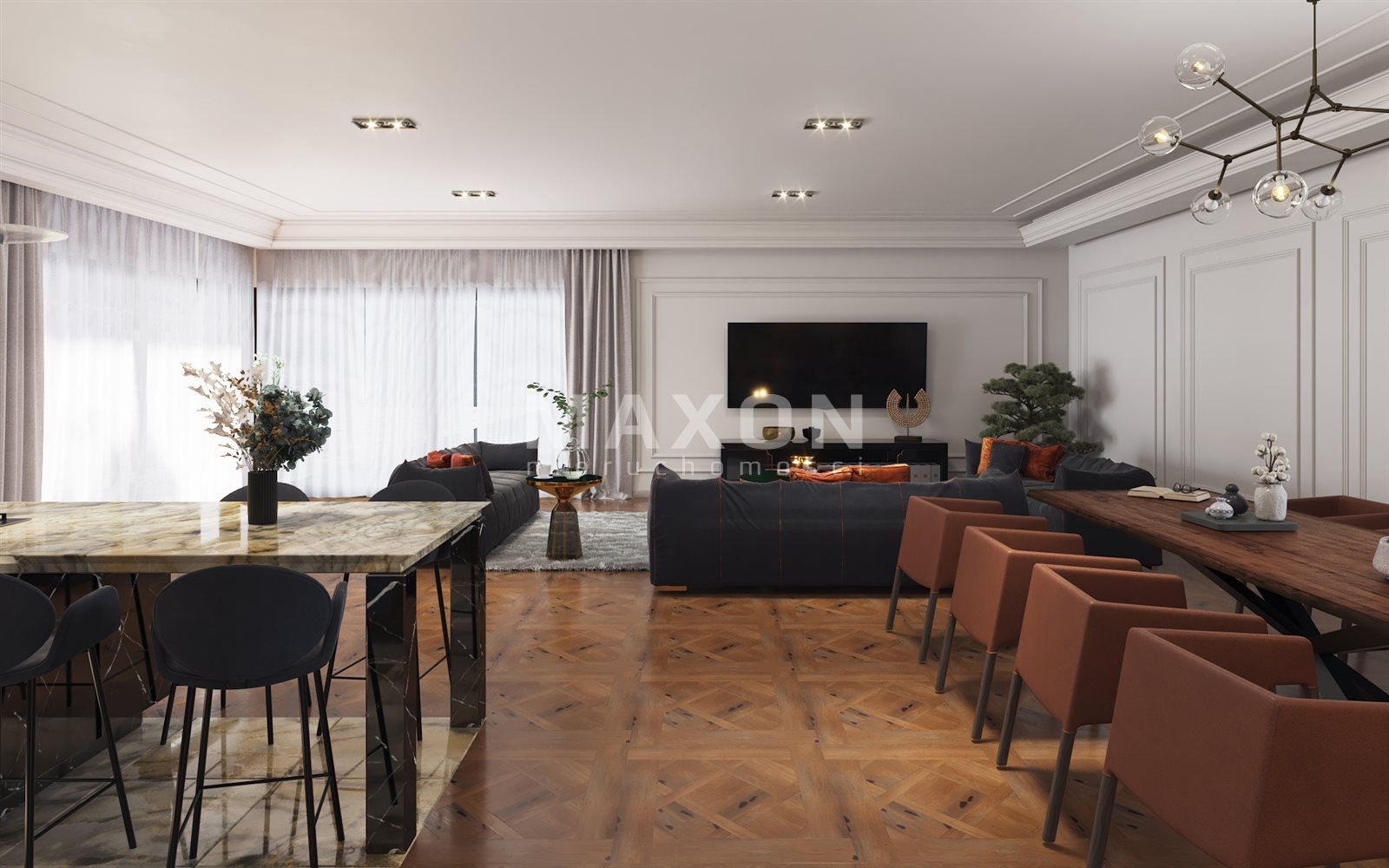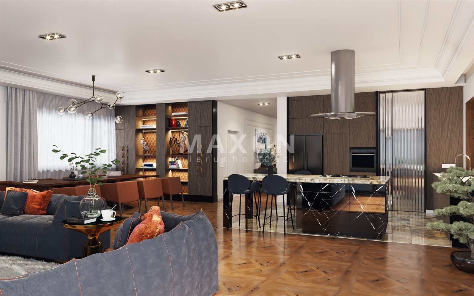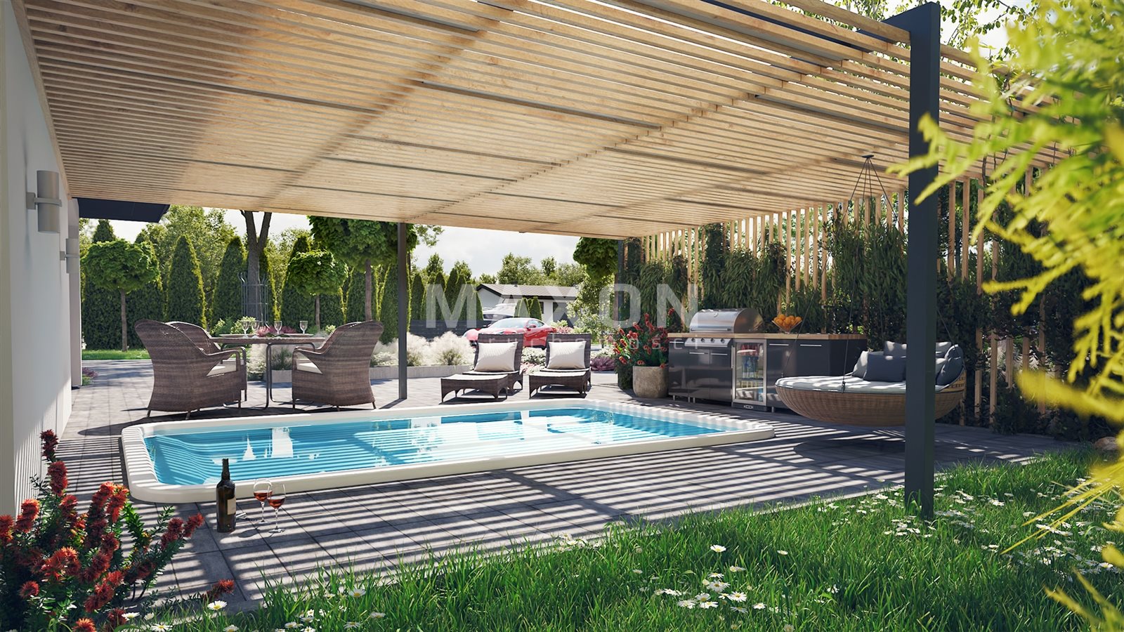 From the living room we go out onto the terrace (80 sq m) surrounded by a designated area for a swimming pool, jacuzzi, bar, and sauna. It is the perfect place to relax and unwind