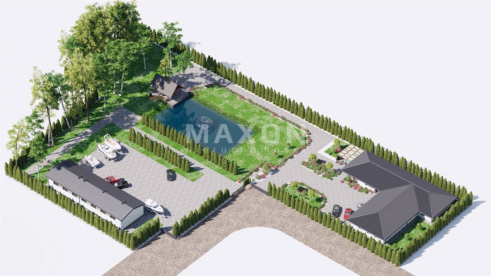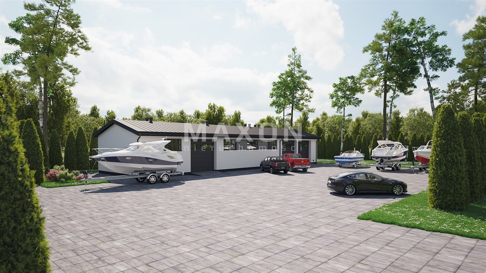Last but not least is the utility area, a place where we can store motor yachts, campers or other large vehicles. A large detached garage can be built here. The area can be arranged as desired. This space has a separate entrance gate and a heavily paved area so that heavy equipment can be parked here. This part is located in such a way that it can be separated from the recreational area.