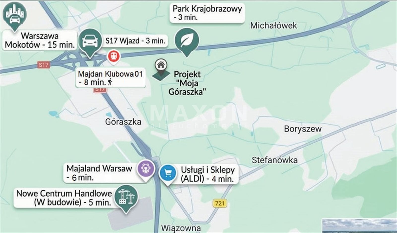 The house is located in a perfectly communicated location - it takes about 30 minutes by car to get to the center of Warsaw, and the nearest bus stop is only 500 meters from the property. Numerous amenities are available in the area, including a Lidl 11 minutes away, an elementary school and kindergarten within a 4 km radius, and the green areas of the Mazovian Landscape Park, which can be reached by bicycle in 10 minutes. A modern shopping and entertainment center with the Majaland amusement park is being built 1.5 km away, with an opening scheduled for 2027.