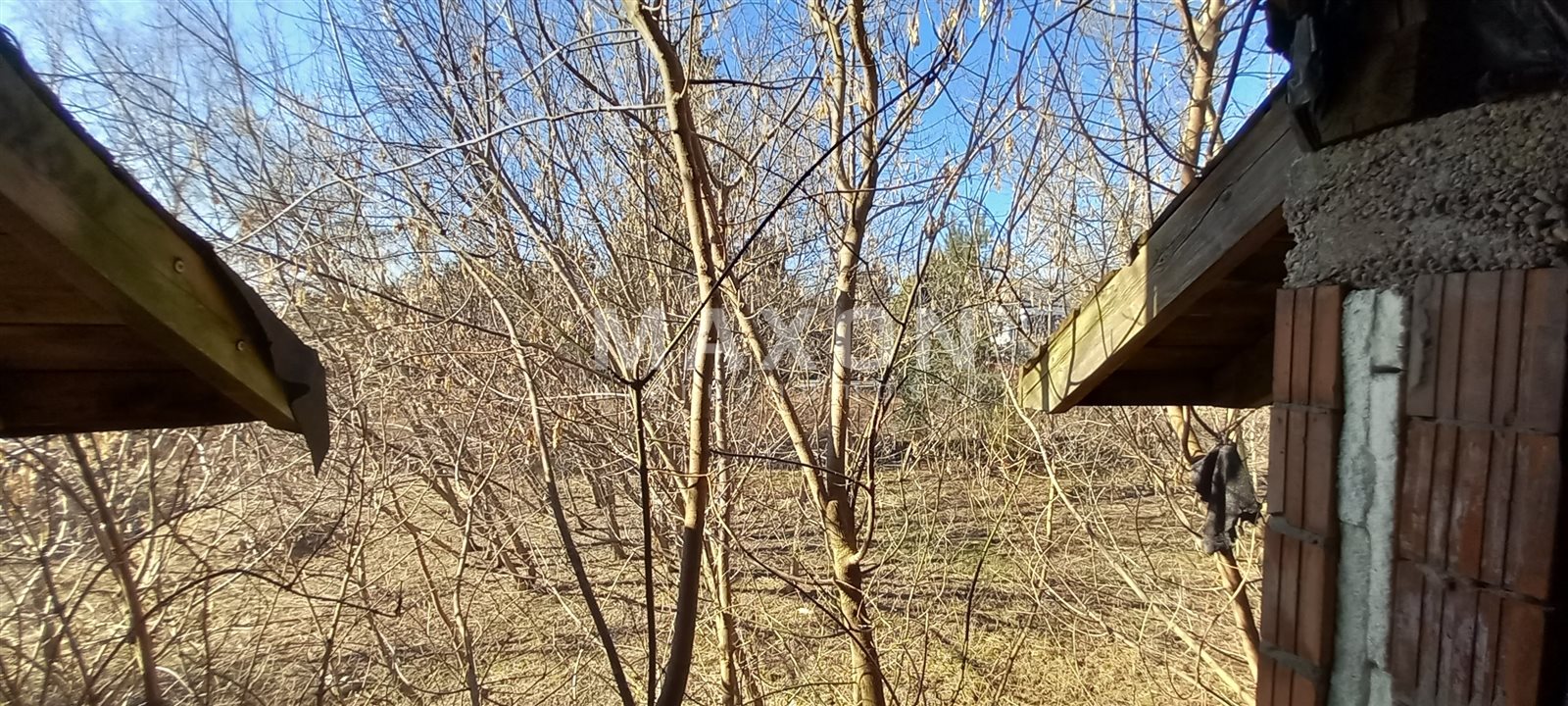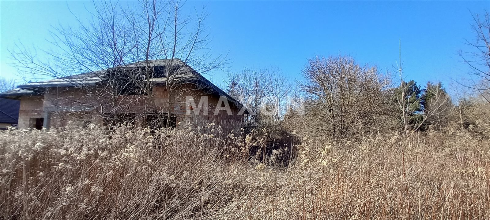 The house is located in the middle of the plot, surrounded by greenery - shrubs and trees.
