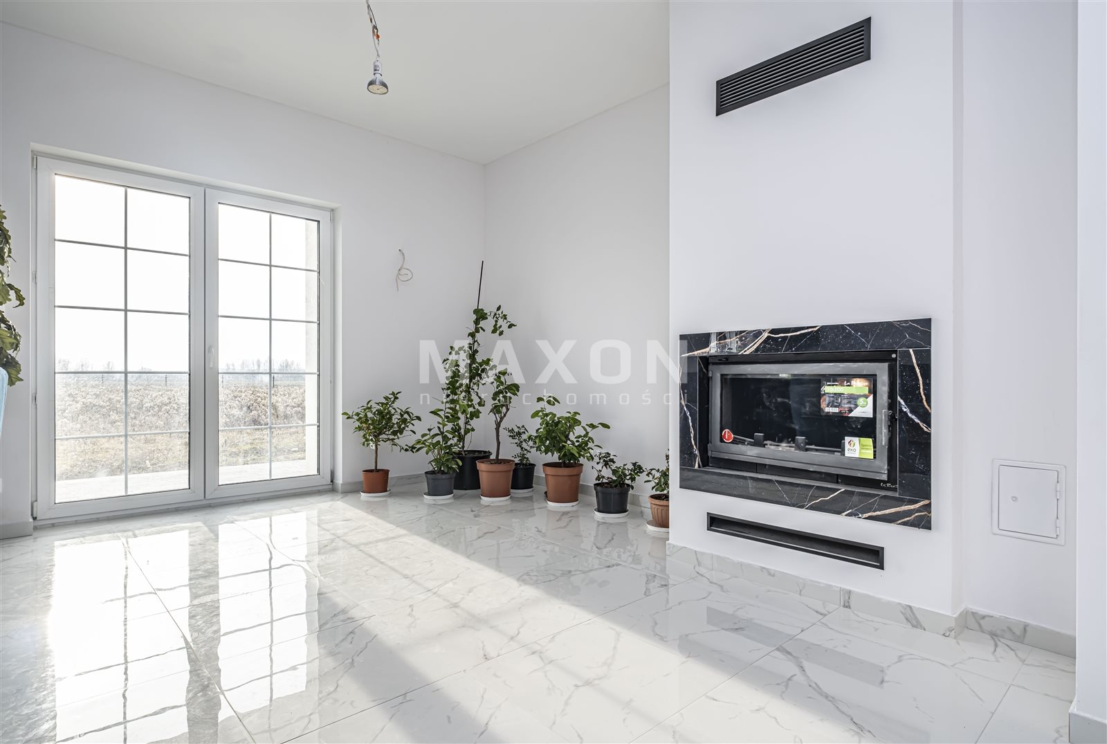 elegant living room with a fireplace and access to the terrace,