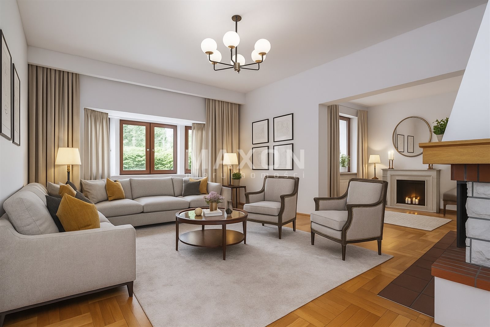 BDetached house, built using traditional brick technology. Exterior facade finished with plaster and clinker, insulated. Roof covered with BRASS ceramic tiles in brick color. Wooden windows, double-glazed. The interior of the house finished with good quality materials: on the floor parquet laid in herringbone, window and door frames made of solid wood, fireplace finished with sandstone. The height of the living room is 3.15 m.