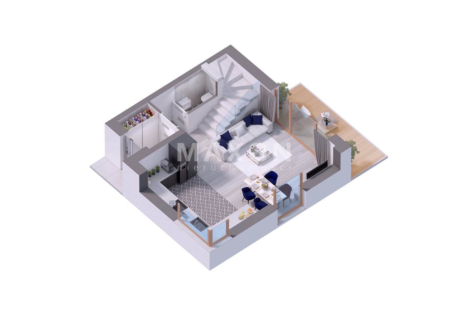 - PARTERY: Windbreak (3.09m), Living room with dining room and kitchen (29.23m), Hall and Staircase (6.10m), WC (1.44m)