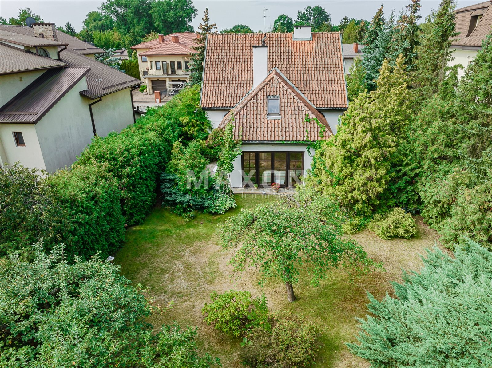 The house is surrounded by trees and is located on a plot of 1063 sqm.