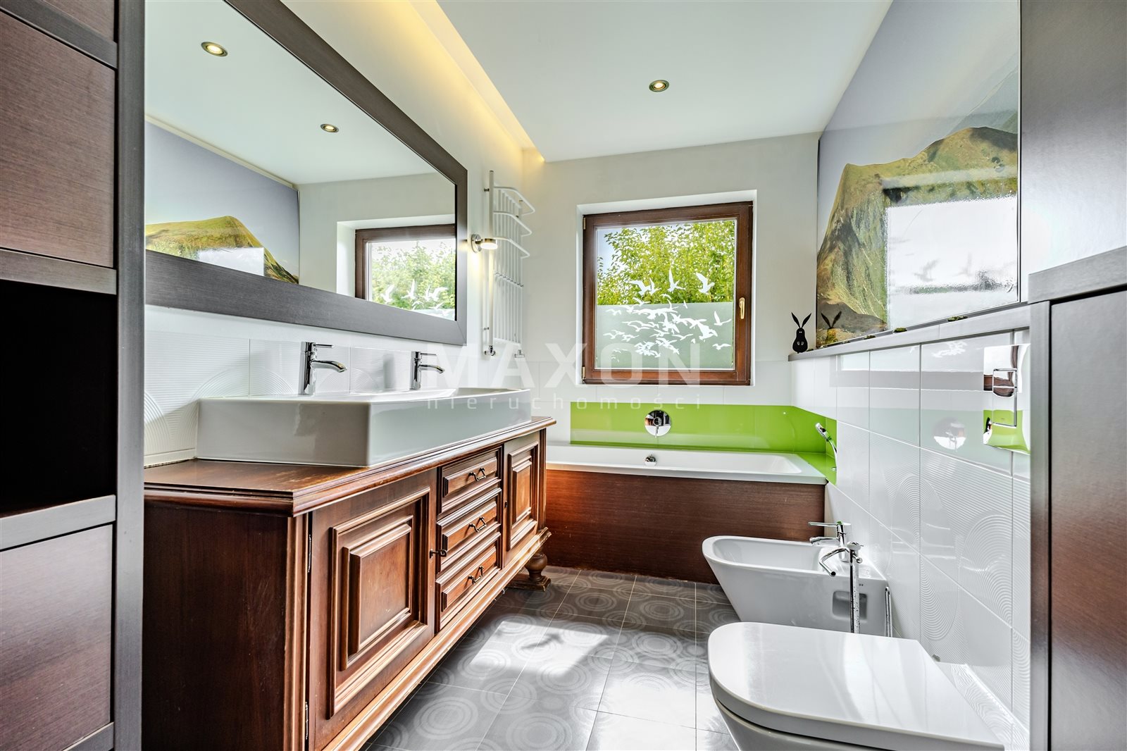The landscaped garden with an automatic watering system provides an ideal place for relaxing outdoors and spending leisure time with the family. There are parking spaces on the property, as well as a garage with an automatic gate, which adds to the convenience.