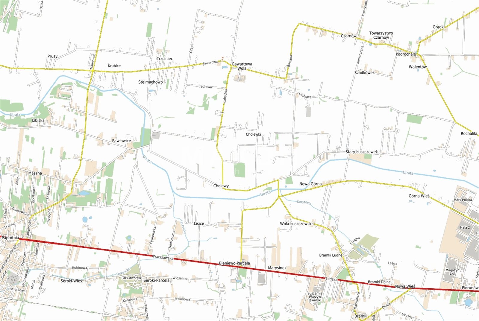 The plot is located between Warsaw and Sochaczew, about 6 km north of the DK92-Warsaw-Poznan route in the 1st line of development surrounded by commercial buildings, workshops, farms and undeveloped land. All areas in the vicinity at Jaworowa Street are designated in the Study for single-family housing and services.
