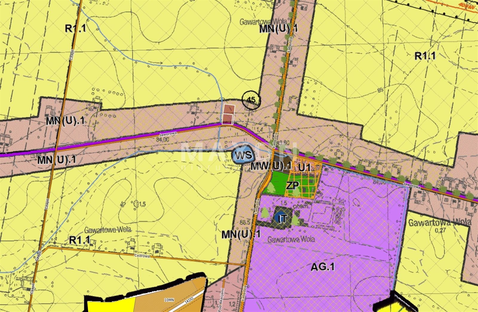 The plot is located on a road with a paved surface, Jawor Street.