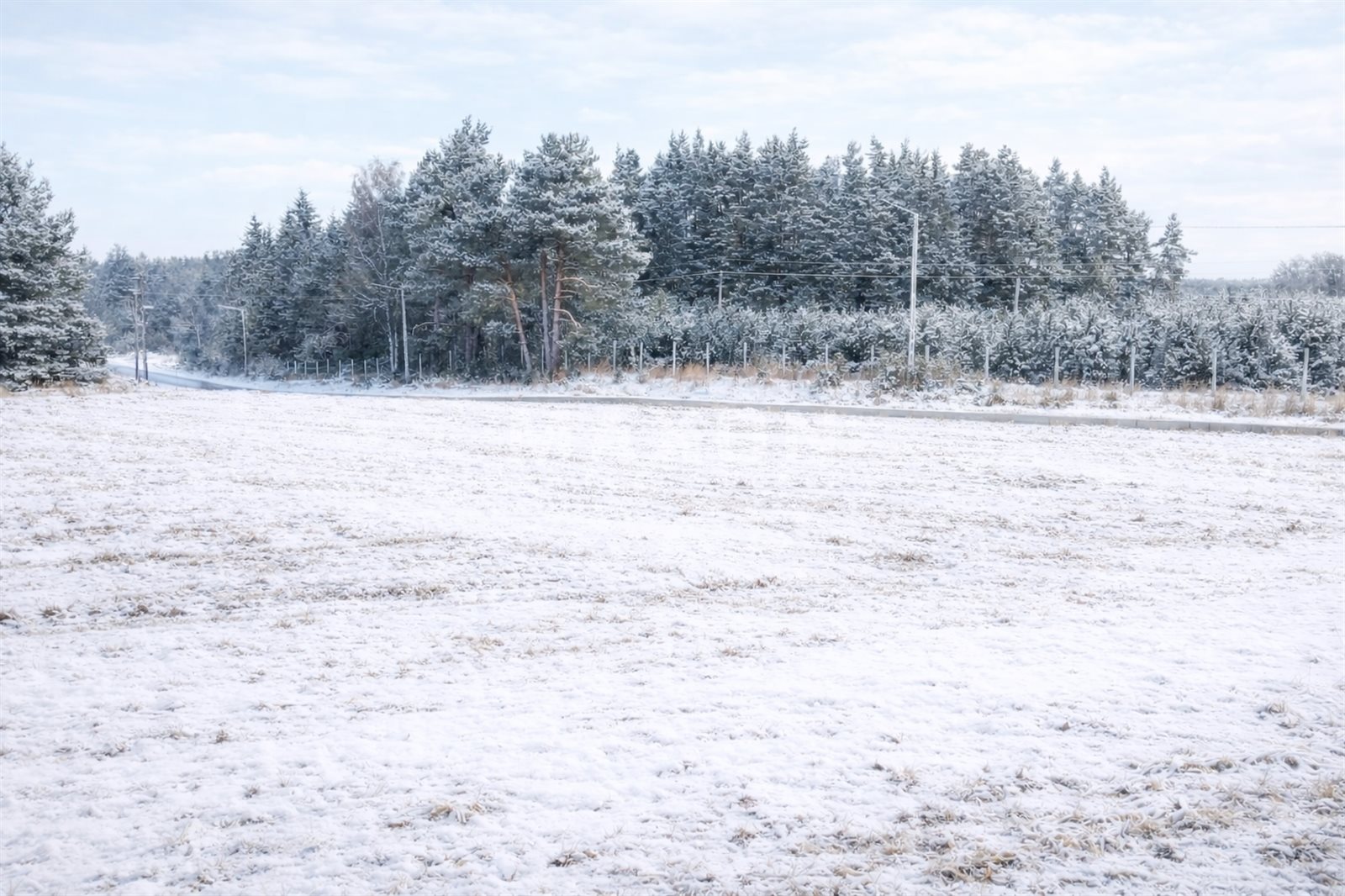 A power line runs along the asphalt road