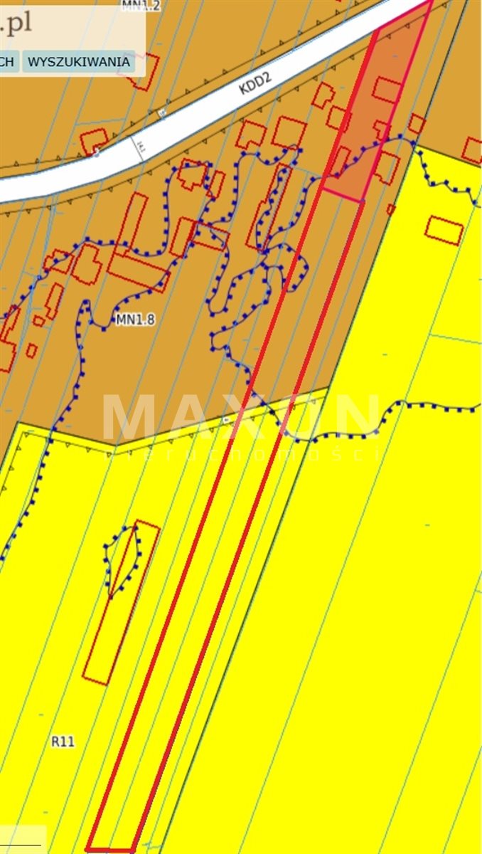Nearby amenities include a school, a church, and a Dino supermarket. The lot is situated on one of the main roads in Kazuń, but its rear section is very quiet, making it an ideal place to live away from the hustle and bustle of the city.